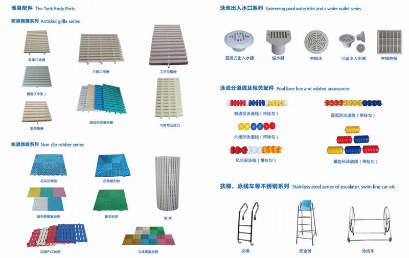 池身配件主要包括:防滑格栅、防滑地胶、泳池出入水口、出发台、泳池分道线及相关配件、扶梯、泳线车等。